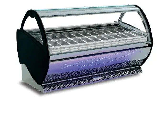 Zakrivljena prednja staklena kompozicija. Kaljene i zagrejane naočare. Dolazi sa posudama od 5 litara za 12-16-18-24 kompleta ili 7-litarskim posudama za 8-10-12-16 kompleta tiganja. Može se pretvoriti u vitrine za sladoled, štapiće, peciva, čokoladu i vafle.
